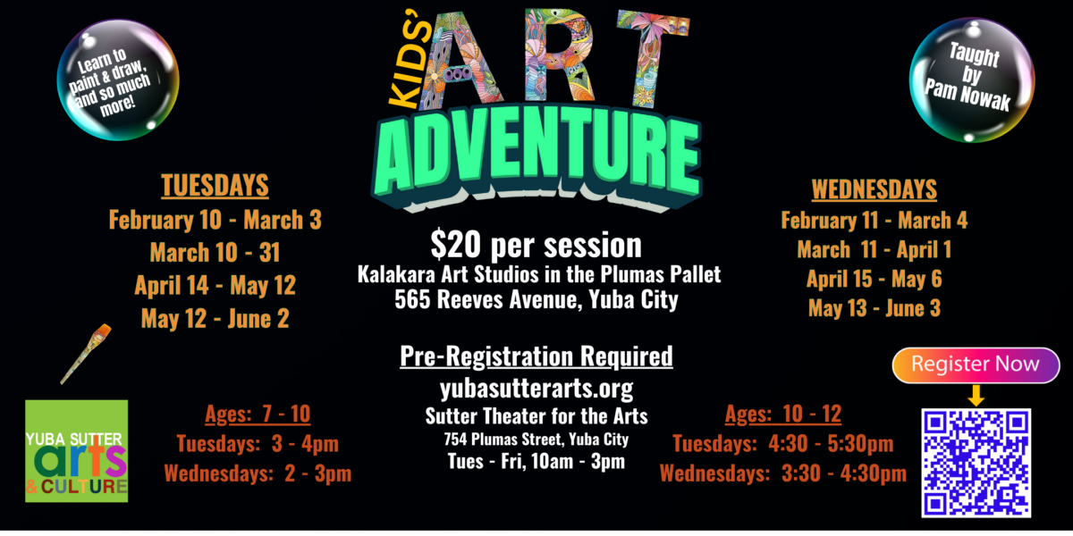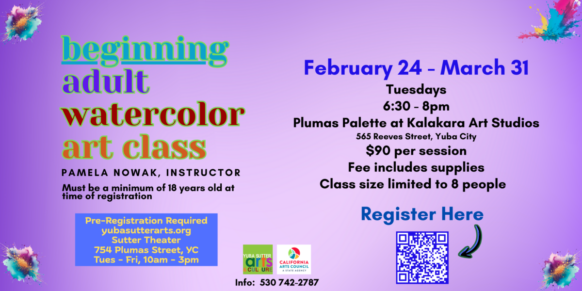 In this art class students will learn how to paint with watercolors, draw, use oil pastels, and more. At the end of the session, you will take home a sketchbook of all your work! The class is taught by Pamela Nowak. Learn skills and have lots of fun while making beautiful artwork! Register at yubasutterarts.org.