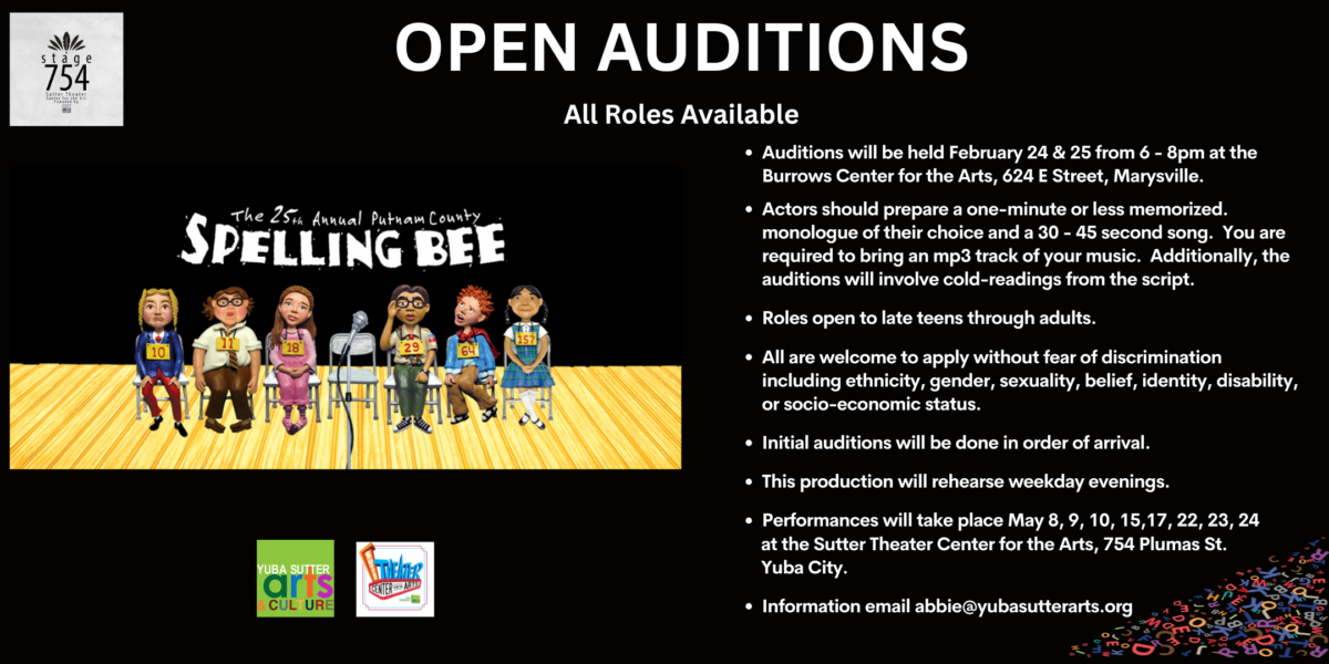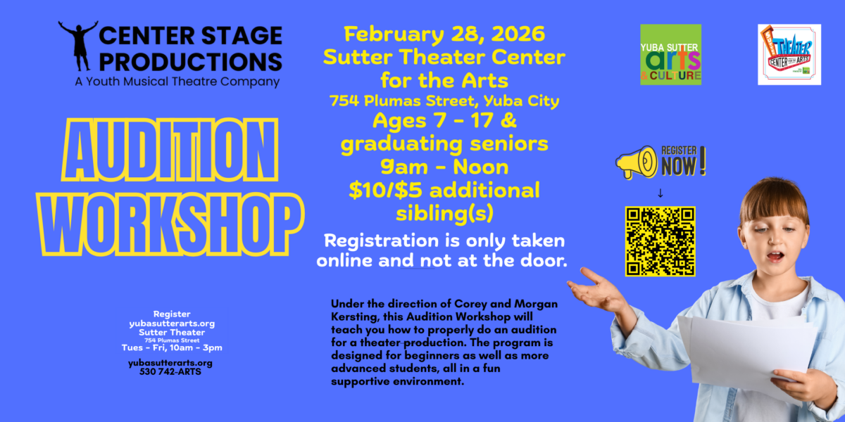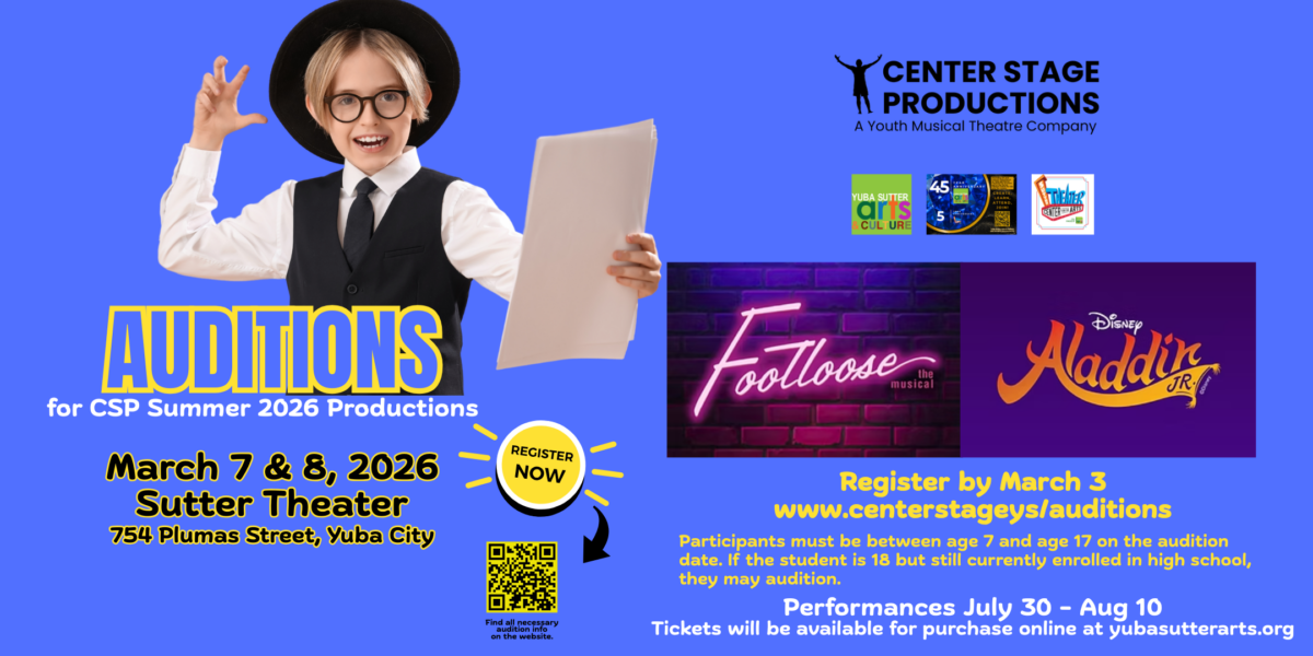 Under the direction of Center Stage founders, Corey and Morgan Kersting, youth ages 7-17 and graduating seniors can audition for a spot in the summer musicals, Disney’s Aladdin Jr. and Footloose! Register for an audition time slot at centerstageys.org. Registrations are only taken online and not at the door. (530)742-2787. Sutter Theater, 754 Plumas Street, Yuba City.