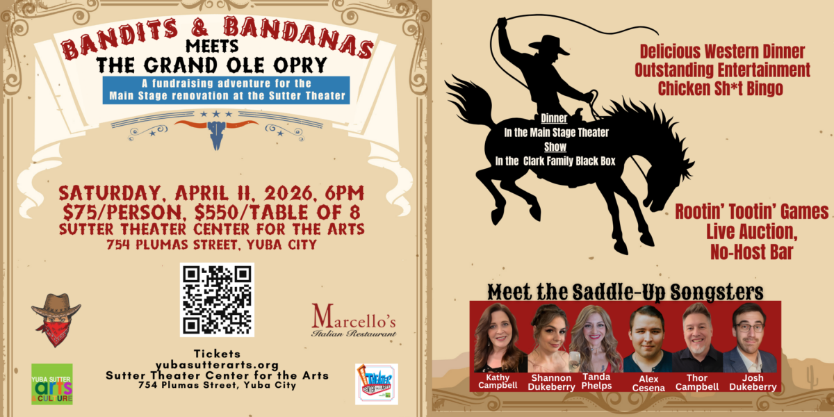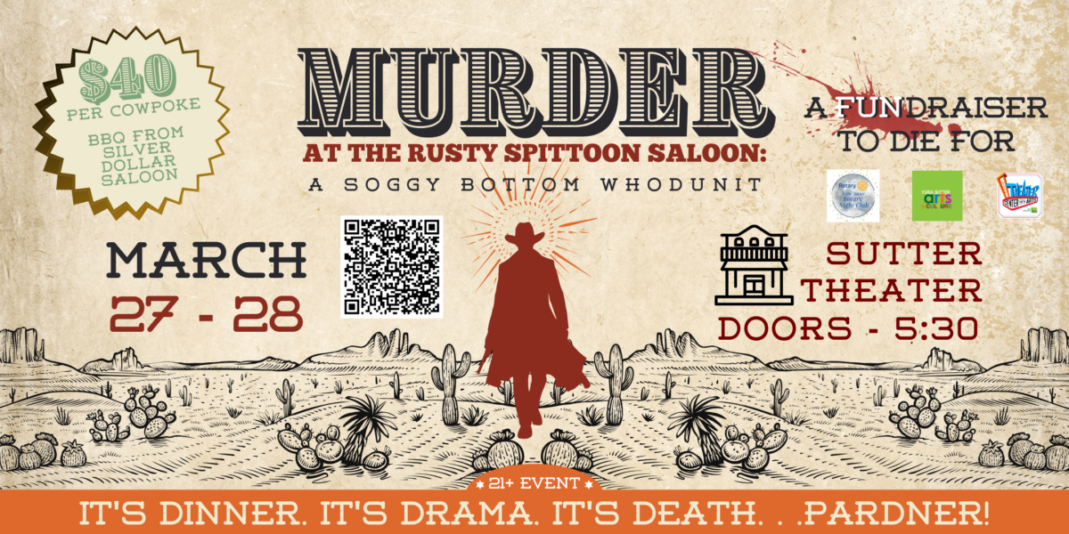 Murder Mystery Dinner by MJUSD & Yuba Sutter Rotary Night Club & Yuba Sutter Arts & Culture It’s Dinner. It’s Drama. It’s Death.And darlin’… it’s a fundraiser everyone’s dying to attend. Saddle up for Murder at the Rusty Spittoon Saloon: A Soggy Bottom Whodunit It’s fixin’ to be a wild, laugh-out-loud, pop-culture-packed night of Old West